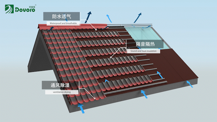 傳統的坡屋面系統,也有一定排水的效果,但屋面瓦下方就是保溫板和防水卷材。