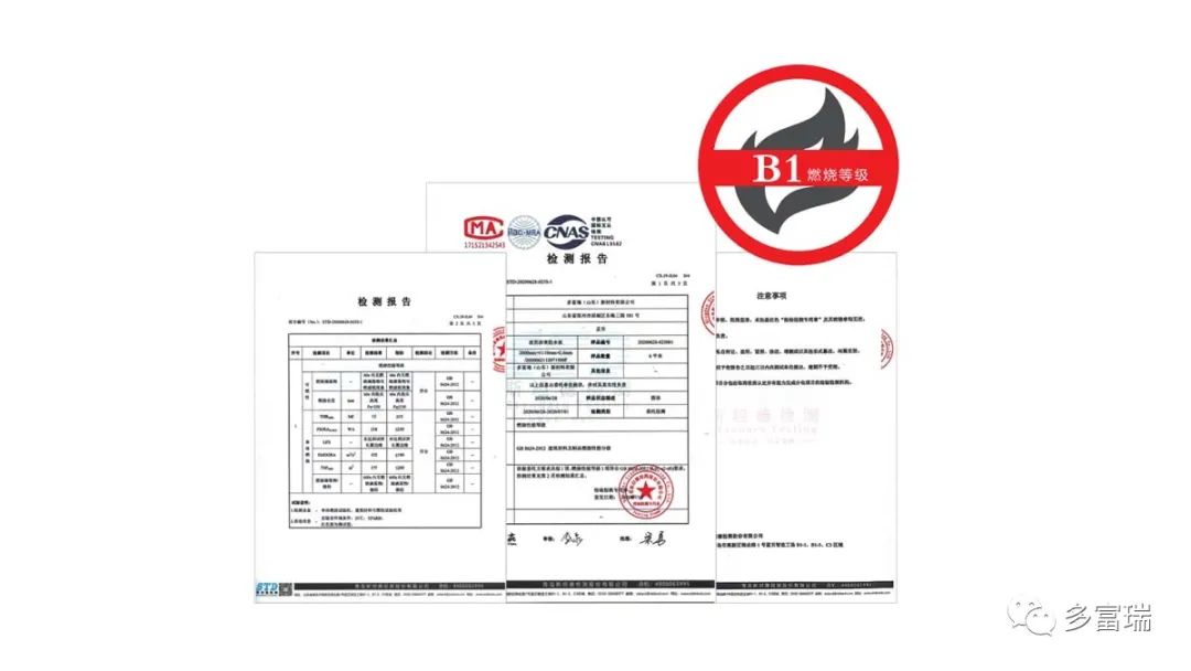 多富瑞產(chǎn)品符合最新的《建筑材料及制品燃燒性能分級》(GB8624-2012),B1級防火材料標(biāo)準。