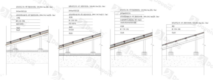 對于民用建筑和滲漏水敏感的建筑屋面,可采用更加全面的施工方案,結(jié)合波形瀝青瓦、波形瀝青防水板、防水卷材等構(gòu)造,共同形成輕質(zhì)、防水、隔熱的屋面系統(tǒng)。