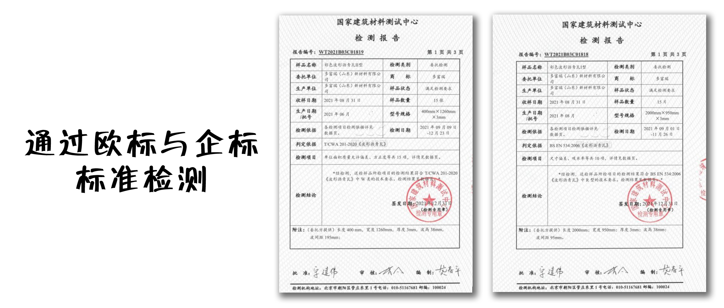通過產(chǎn)品配方的改進、生產(chǎn)工藝的優(yōu)化,瓦材吸水率低至6%左右,瀝青含量≥40%。經(jīng)權(quán)威機構(gòu)檢測認定,波形瀝青瓦的產(chǎn)品性能,已通過甚至遠超企標及歐標標準。