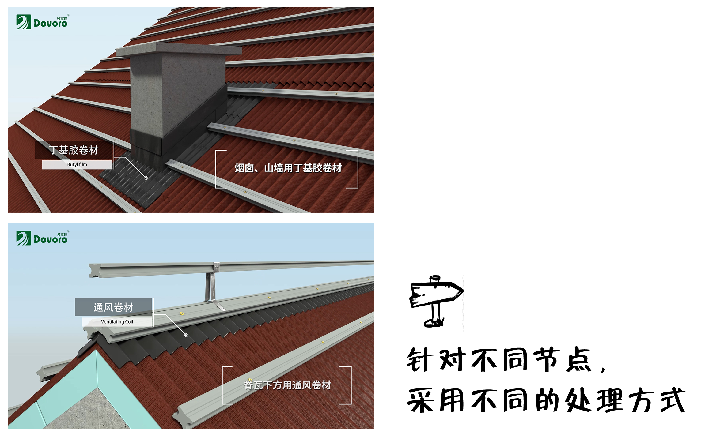 多富瑞精心設(shè)計了不同位置的節(jié)點處理方式,如屋脊、天溝、煙囪等位置,使用防水卷材或通風卷材輔助防水。無需像傳統(tǒng)坡屋面需要大量使用防水卷材,僅在部分位置加強防水性。