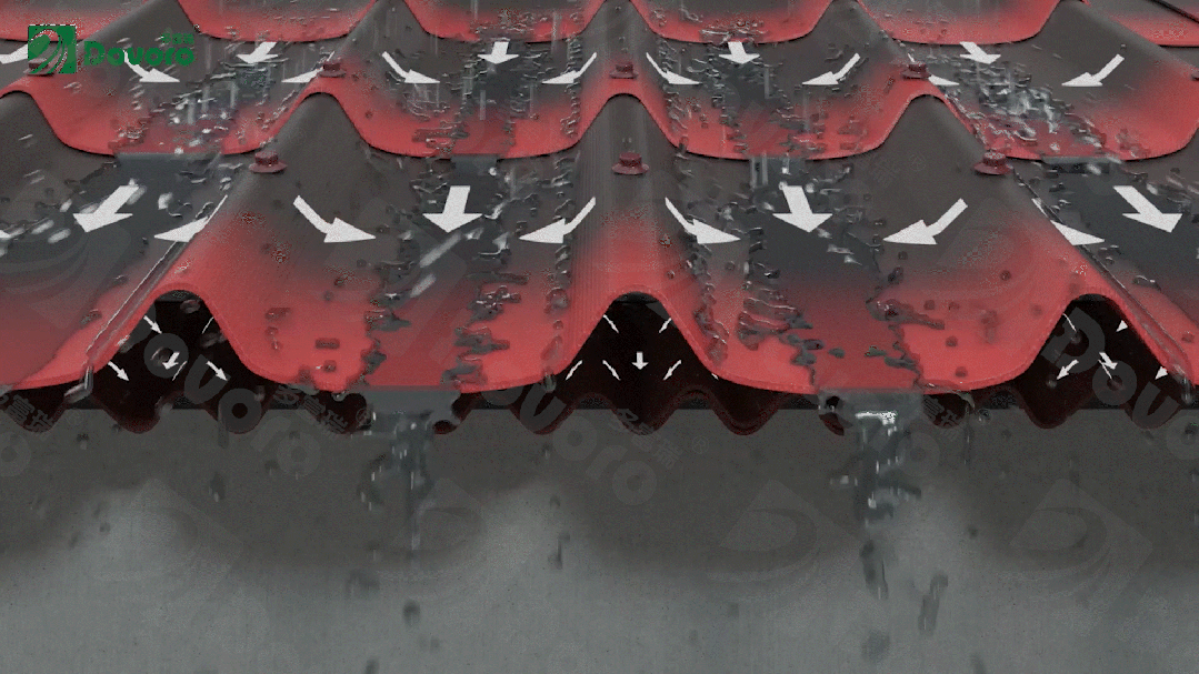波形瀝青瓦的波形設(shè)計,當雨水接觸到屋面,會順著多富瑞精心設(shè)計的角度從波峰流到波谷,從上往下排出屋面。大部分的雨水無法附著在瓦材上,無法聚積,更來不及往下滲漏,屋面就不容易漏水。