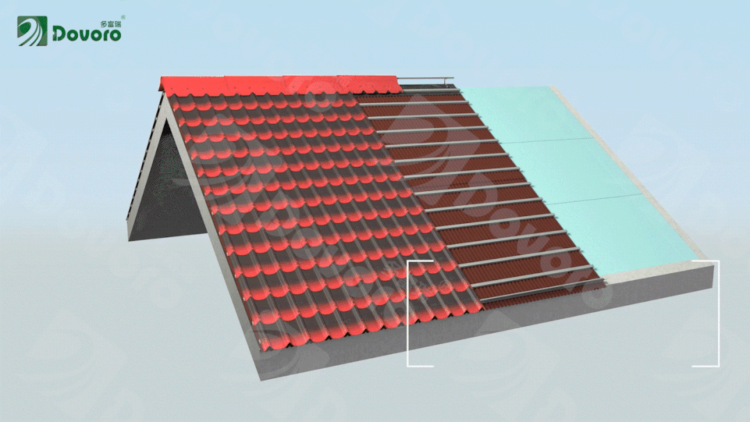 波形瀝青防水板采用了與波形瀝青瓦同樣的防排結合設計。遇到極端降雨天氣,一旦屋面瓦材發生滲漏,雨水也會順著波形瀝青防水板從上往下排出屋面,將屋面漏水的概率降至最低。