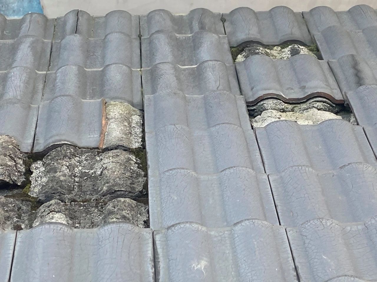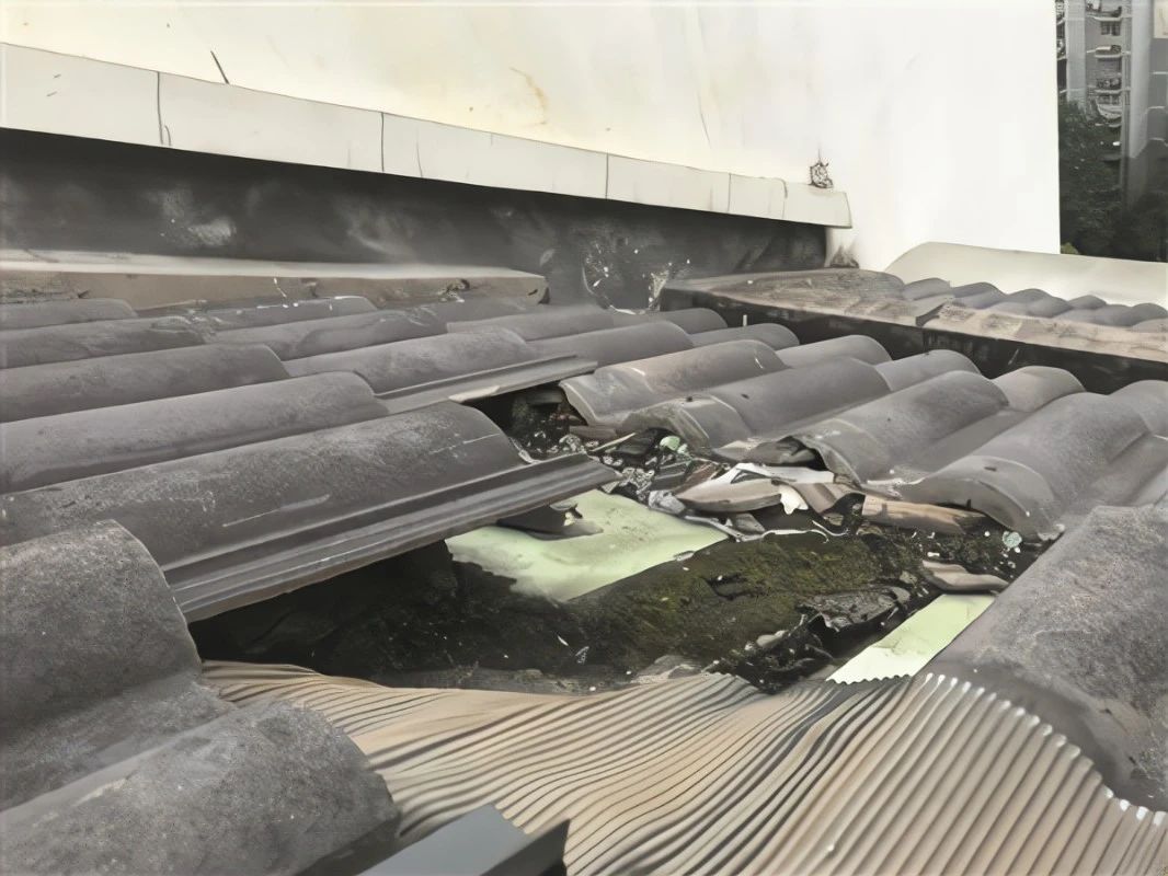 臥漿的水泥砂漿經過長時間的風吹雨淋,水泥開裂導致無法固定瓦材,瓦材移位露出下方的屋面基層,基層進水導致屋面漏水。
