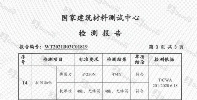 波形瀝青瓦與波形瀝青防水板,通過22次凍融循環(huán)測試,該測試模擬嚴(yán)寒地區(qū)的天氣狀況,降雨后遇到低溫冰凍,融化后再次冰凍,以檢測在嚴(yán)寒地區(qū)的抗凍融性能。在極寒條件下,波形瀝青瓦與波形瀝青防水板仍可保持優(yōu)異的產(chǎn)品性能。